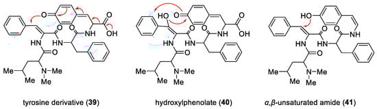 Quinone may serve as a possible precursor, consisting of a dihydrophenylalanine-phenylalanine linked to an oxidized tyrosine (39). In the biosynthetic pathway of 13- or 14-membered alkaloids, a decarboxylation followed by a Michael addition can lead to the formation of the macrocycle. Another possibility involves the attack of a β-hydroxyl group on the quinone carbonyl, followed by decarboxylation and the subsequent formation of hydroxylphenolate (40). Alternatively, the phenolic hydroxyl group may attack the β-carbon of the α, β-unsaturated amide (41) (Scheme 4) [47,48].
