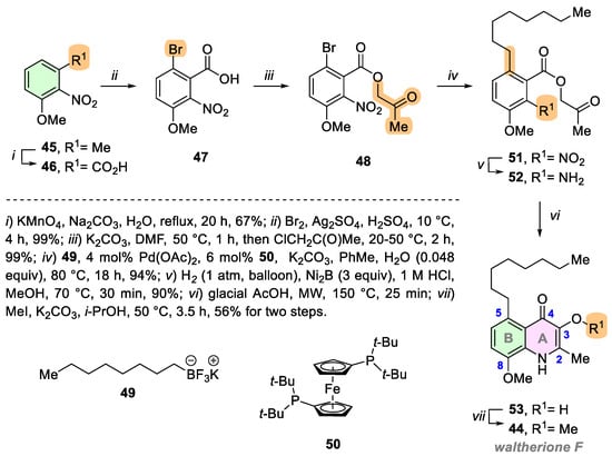 In 2018, Kaufman and Larghi’s group reported the first total synthesis of waltherione F (44) (Scheme 5) [51]. Like most quinolin-4(1H)-one products from Waltheria, this natural compound features a 2-methyl-3-methoxy substitution at the A-ring. Notably, it bears an n-octyl side chain and a methoxy group at the B-ring’s 5 and 8 positions, respectively.