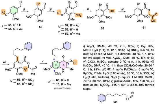 Subsequently, the successful attachment of the 5-phenylpentyl group was accomplished using the established palladium-catalyzed Suzuki–Miyaura [51]. The bromoarene 61 reacted with potassium trifluoro(5-phenylpentyl)borate 62 to yield compound 63 with a high efficiency of 93%, demonstrating the effectiveness of this cross-coupling method for introducing alkyl side chains (Scheme 6). Notably, the alkyltrifluoroborate salt 62 was synthesized from the commercial (2-bromoethyl)benzene through a four-step process (details not depicted). The final stages in synthesizing melovinone (10) mirrored the previously established protocols for waltherione F (44), involving a nickel-catalyzed selective nitro reduction, Niementowski type cyclization/rearrangement, and methylation, culminating in a 32% yield of melovinone (10) over these steps (Scheme 6).
