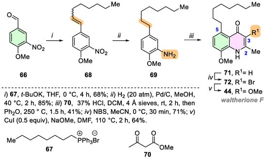 In 2019, Cox’s group reported the total synthesis of waltherione F (44) and its analogs using the Conrad–Limpach synthesis of the quinolin-4(1H)-one scaffold as the key step (Scheme 7) [57]. The commercially available 4-methoxy-3-nitrobenzaldehyde (66) underwent a Witting reaction [58] with octyltriphenylphosphonium bromide (67), yielding olefin 68 at a 68% yield. Subsequently, a one-pot reduction in both the nitro group and the C=C bond of 68 using Pd/C under 20 atm of H2 produced aniline 69 with an 85% yield (Scheme 7).