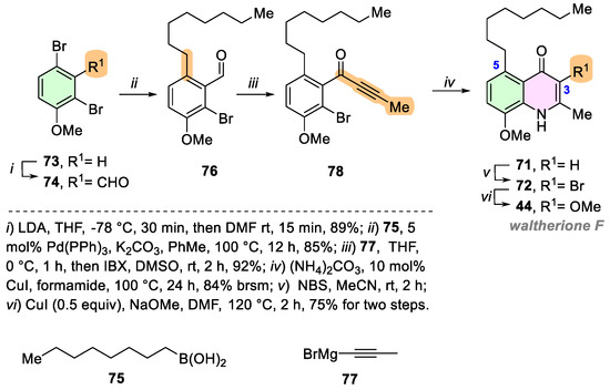 Finally, waltherione F (44) was obtained via a six-step route with an overall yield of 33%. The efficiency and convenience of this method were demonstrated for other 2-methylquinolin-4(1H)-ones obtained through orthogonal ammonia insertion into ortho-haloaryl ynones.