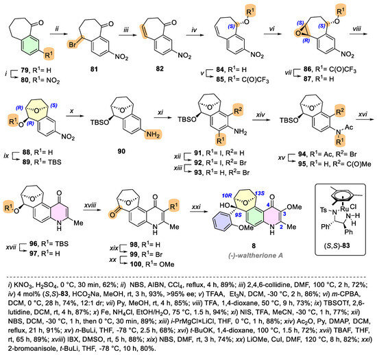 After optimization of the conditions for the Camps cyclization [71], the 2-methylquinolin-4(1H)-one 96 was obtained with 72% yield using t-BuOK as a base in 1,4-dioxane at 100 °C. Deprotection of the TBS group, followed by oxidation with IBX in DMSO at room temperature, afforded compound 98 in 74% yield. Then, as reported previously for the synthesis of waltherione F (44), the 3-methoxy group was introduced in a two-step sequence of bromination followed by methoxylation, yielding compound 100. Finally, treatment of 2-bromoanilose with t-BuLi in THF at −78 °C generates the organolithium reagent in situ for the stereoselective 1,2-addition to carbonyl group of 100. This process selectively proceeded through the substrate`s convex face, yielding waltherione A (8) in an 80% yield.