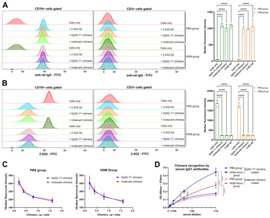 Dp52–71 and irrelevant chimeras were constructed by coupling rat 2.4G2 monoclonal antibodies with peptide epitopes from Der p1 or irrelevant peptides, respectively. Mass-spectral analysis data indicate that 14–16 peptides are conjugated to each single IgG molecule [30]. The capacity of the chimeric molecules to bind to FcγRIIb receptors was studied by FACS analysis, using splenocytes from healthy and HDM-treated mice. Both the Dp52–71and irrelevant chimeras bound to the surface of CD19 cells with the same intensity as the pure 2.4G2 antibody in PBS- and HDM-challenged mice. No such binding was observed in the CD3 population (Figure 1A).