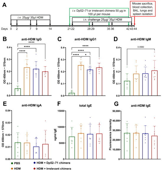 Scheme of the chronic HDM allergy model and treatment schedule (A). Serum levels of anti-HDM IgG (B), IgG1 (C), IgM (D), IgA (E), IgE (G), and total IgE antibodies (F) in healthy mice and HDM-challenged mice treated with PBS, Dp52–71 chimera, or irrelevant chimera, measured by ELISA. Data are shown as mean ± SD of 8–9 mice per group. p values are calculated using a one-way ANOVA following Tukey’s multiple comparisons test; * p < 0.05; **** p < 0.0001. Data are representative of at least 3 independent experiments.