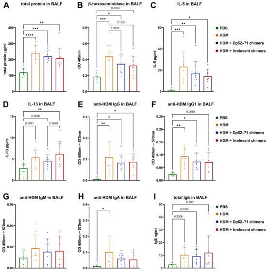 The BALF concentration of IL-13 was higher in the irrelevant chimera group than in the healthy animals, but such a statistically significant difference was not observed in the Dp52–71 chimera group (Figure 3D). Elevated levels of anti-HDM IgA antibodies in BALF were observed in the HDM-challenged group compared to the PBS mice (Figure 3H). No statistically significant differences were observed in HDM-specific IgM (Figure 3G), total IgE (Figure 3I), IL-4, and IL-9 levels between the groups.