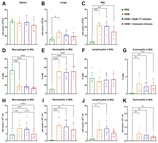 Total cells (per milliliter) isolated from spleen (A), lungs (B), and BAL (C). Differential staining of cells in BAL, defining macrophages (D,H), neutrophils (E,I), lymphocytes (F,J), and eosinophils (G,K), and expressed as percentages and cell count per ml of recovered BAL liquid. Data are shown as mean ± SD of 8–9 mice per group. The differences between the groups were evaluated using a one-way ANOVA followed by Tukey’s multiple comparisons test, or a Kruskal–Wallis test followed by Dunn’s multiple comparisons test, depending on the normality of the data; p values are indicated on the graphs: * p < 0.05; ** p < 0.01; *** p < 0.001; **** p < 0.0001.