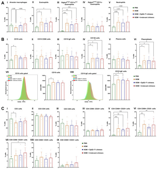 Phenotyping of immune cells in the lungs by FACS analyses. (A) Characterization of myeloid cell types—alveolar macrophages (I), SiglecFhigh CD11clow (III), SiglecFmed CD11c− (IV) and total eosinophils (II), and neutrophils (V)—presented as the percentage of the parent population. (B) Analysis of B and antibody-secreting cells—percentages of CD19 cells (I), CD19 CD80 cells (II), CD19 IgE cells (III), CD138 cells (IV), plasma cells (V), plasmablasts (VI), and CD32 mean fluorescent intensity (MFI) of CD19 (VII) and CD19 IgE cells (VIII). (C) Phenotyping of T cells—CD3 cells (I), CD3 CD4 cells (II), CD3 CD8 cells (III), CD4 CD69 − CD25 + cells (IV), CD4 CD69 + CD25 + cells (V), CD4 CD69 + CD25 − cells (VI), CD8 CD69 − CD25 + cells (VII), CD8 CD69 + CD25 − cells (VIII), and CD4 CD69 + CD25 + cells (IX). Data are shown as mean ± SD of 8–9 mice per group. The differences between the groups were evaluated using a one-way ANOVA followed by Tukey’s multiple comparisons, or a Kruskal–Wallis test followed by Dunn’s multiple comparisons test, depending on the normality of the data; p values are indicated on the graphs: * p < 0.05; ** p < 0.01; *** p < 0.001. Data are representative of at least 4 independent experiments.