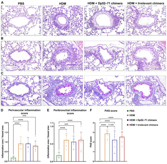 PAS-positive airway epithelial cells, representing the goblet cells responsible for mucus production, were found in the airways of the HDM-challenged groups, but not in the healthy mice (Figure 6C,F). A non-significant decrease in histopathological PAS score was shown in the animals administered Dp52–71chimera compared to the HDM group (p = 0.1025).