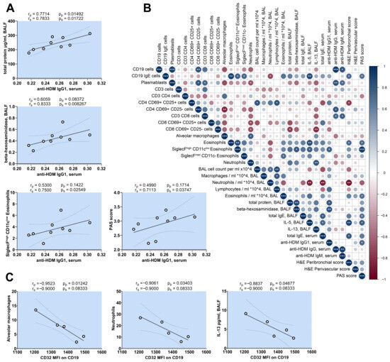 Correlation analysis of HDM allergy group. Correlation analysis of serum levels of anti-HDM IgG1 (A) and CD32 expression of B cells in the lungs (C) versus other parameters. Pearson (rp) and Spearman (rs) correlation coefficients and p values for Spearman (ps) and Pearson (pp) correlation analysis are indicated above each figure. (B) Correlation matrix of key immunological parameters achieved through Spearman’s test (* p < 0.05; ** p < 0.01; *** p < 0.001).