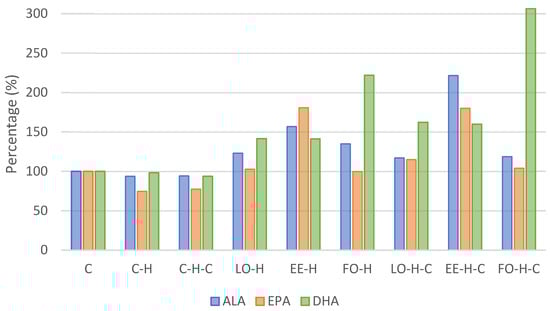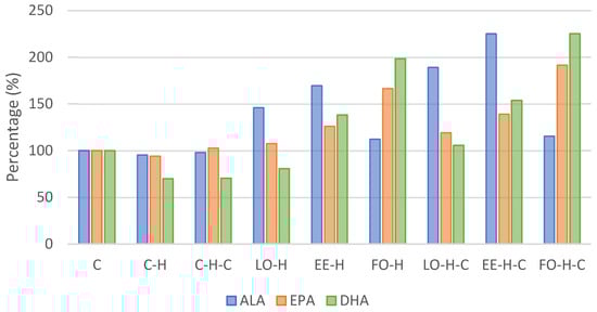 Considering the content of acids from omega-3 group, the content of alpha-linoleic acid (C18:3n3, ALA) was the highest in group EE-H-C and differed significantly from all other groups (Table 2). An increase in the content of this acid was found in all supplemented groups; compared to the control, it was more than 2-fold higher in group EE-H-C and over 50% higher in group EE-H (Table 2, Figure 1). The content of eicosapentaenoic acid (C20:5n3, EPA) was the highest in group EE-H and it differed significantly from other groups except LO-H-C and EE-H-C (p < 0.05). Comparing to the control group C, the level of EPA increased by over 80% in groups EE-H and EE-H-C (Table 2, Figure 1). In the case of docosahexaenoic acid (C22:6n3, DHA), its level was the highest in group FO-H-C and it differed significantly from all other groups (p < 0.05). The percentage content compared to the control increased by more than 3-fold in group FO-H-C and over 2-fold in group FO-H (Table 2, Figure 1).