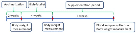 This study was carried out on male Wistar rats obtained from the monozygotic Charles Rivers Laboratories (Germany). The rats were maintained individually in the vivarium of the Faculty of Veterinary Medicine, Wrocław University of Environmental and Life Sciences, Poland, at a temperature of about 21 °C with a 12 h light/dark cycle. They were randomly divided into 9 groups (simple randomization–random number generation), with eight animals in each group. The rats were fed the control diet (C) with w/10% energy from fat (diet no. C 1090-10; https://altromin.com/products/specialdiets/highfatdiets/C1090-10; accessed on 20 December 2024) and high-fat diet (H) with w/70% energy from fat (42% fat) (diet no. C1090-70; https://altromin.com/products/specialdiets/highfatdiets/C1090-70; accessed on 20 December 2024) from Altromin International (Germany), and had ad libitum access to water. The scheme of supplementation is presented in Table 6, and the scheme of the experiment in Figure 3.