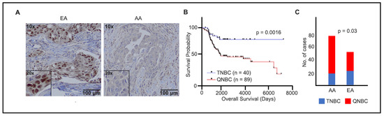 AR immunostaining and overall survival analysis in TNBC samples of EA and AA patients. (A) Micrographs representing AR staining in tumor tissues from EAs (80%) and AAs (6%), AR (brown) and nuclei (blue), Insets: 20× objective; (B) Kaplan–Meier plots of overall survival in TNBC (n = 40) and QNBC (n = 89) patients; (C) cases that were EA and AA TNBC and QNBC by IHC.