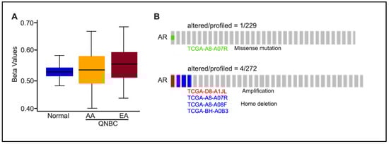 DNA methylation of AR gene of AA and EA patients of TCGA database. (A) Methylation status of AR promoter region in normal and QNBC (AA vs. EA). Beta value ranges from 0 to 1 (no to complete methylation); significance based on unpaired t-test; (B) oncoprint showing AR mutations and CNAs in AR-low samples (n = 278).