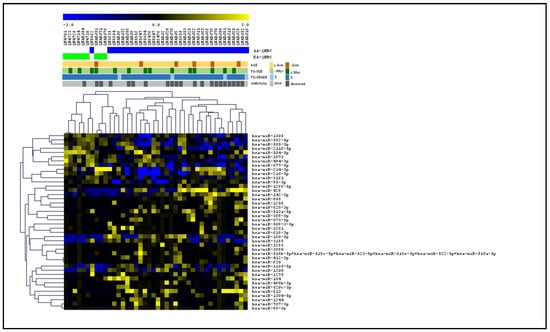 To assess how the dysregulated miRNAs identified in the analyzed groups may influence cancer-related biological processes and pathways, we employed Diana miRPath v.3.0 (diana.imis.athena-innovation/gr/DianaTools (accessed on 3 April 2024)). The analysis considered adjusted p-values with FDR correction. Enrichment analysis of multiple miRNA gene targets comparing each set of miRNA targets to all known KEGG (Kyoto Encyclopedia of Genes and Genomes) pathways were obtained and selected by significant p-value (p < 0.05) and cancer-associated biological functions.