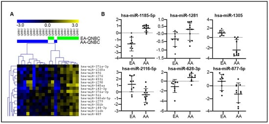 MiRNA expression profiling analysis of QNBC cases of EA and AA patients. (A) Partial supervised hierarchical cluster (SHC) of global miRNA profiling showing DE miRNAs between AA QNBC (n = 10, blue bars) and EA QNBC (n = 9, green bars) (validation cohort). (B) Six miRNAs DE between AA QNBC and EA QNBC with expression directions common in discovery and validation cohorts.