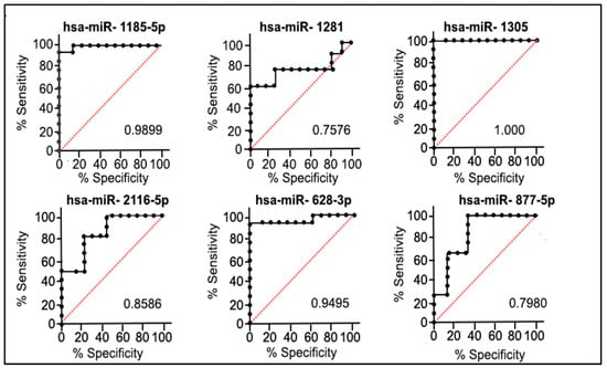 A remarkable high power was observed in the selected six miRNAs, with the same direction expression common to both the discovery and validation cohorts of the patients, in discriminating the QNBC tumors from AAs and EAs. The AUC value of the individual miRNAs ranged from 0.7576 to 1.0, with miR-1305 presenting the highest power in discriminating the two groups (Figure 5). ROC analysis was also performed with all combinations of the six selected miRNAs: a combination of three miRNAs (hsa-miR-877-5p, hsa-miR-2116-5p, and hsa-miR-1281) showed a high discriminatory potential with an AUC of 0.939.