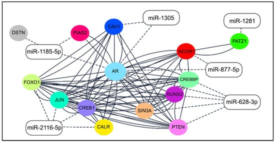 Network of six miRNAs and experimentally validated targets of AR gene (color circles). Solid lines: protein–protein interaction; dashed lines: miRNA–mRNA interaction (Cytoscape 3.9.1).