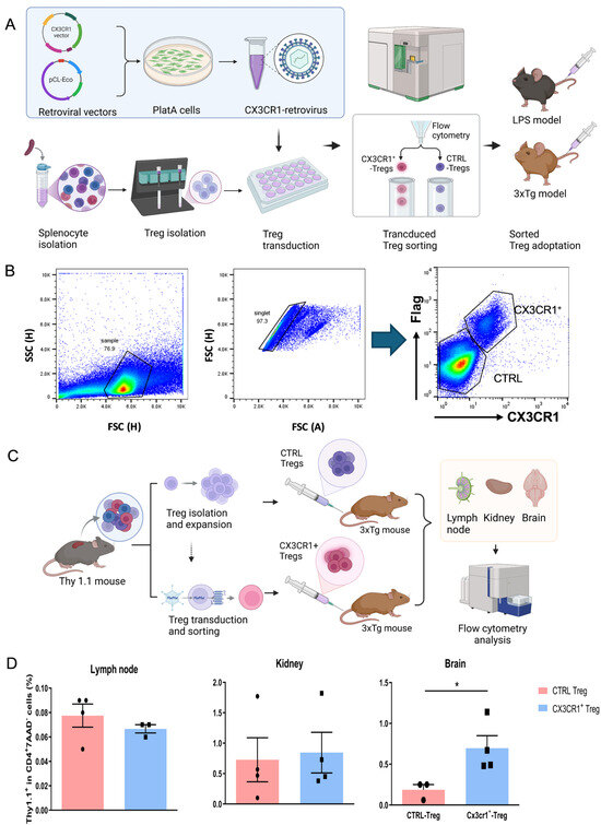 To evaluate the effects of engineered Tregs on AD pathology, Tregs were transduced with a CX3CR1+ retrovirus. Control (CTRL) and CX3CR1+ Tregs were sorted and adoptively transferred to LPS-induced and 3xTg-AD mice (Figure 1A,B). To assess brain trafficking, CX3CR1−Flag− and CX3CR1+Flag+ Tregs were generated from the splenocytes of Thy1.1 mice [24]. Five-month-old 3xTg-AD mice (Thy1.2+) received an adoptive transfer of 1 × 105 Thy1.1+ Tregs. Seven days later, the mice were sacrificed, and the inguinal lymph nodes, kidneys, and brains were harvested. T cells were enriched from the kidneys and brains using 30–70% Percoll density gradient centrifugation and analyzed by flow cytometry. Flow cytometry analysis revealed that CX3CR1+Flag+ Tregs were significantly more prevalent in the brains (* p < 0.05), while no significant differences were observed between CX3CR1−Flag− and CX3CR1+Flag+ Tregs in the inguinal lymph nodes or kidneys. These data suggest that CX3CR1 expression may enhance the migration of Tregs to the brain (Figure 1C,D).