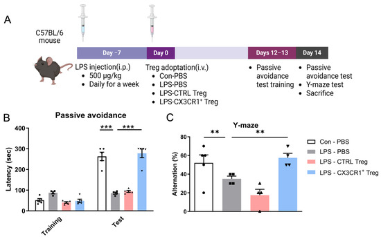 Mice were divided into four groups, each containing five males. The control group received daily PBS injections and was also administered PBS as a vehicle control instead of Tregs. The LPS group was treated with LPS at a dose of 500 μg/kg, given daily for a week, and similarly received PBS injections instead of Tregs. The control Treg group and the CX3CR1 Treg group also received daily LPS injections like the LPS group. Additionally, 24 h after the last LPS injection, the control Treg group received Tregs without CX3CR1, and the CX3CR1 Treg group received Tregs with CX3CR1, both administered intravenously at 1 × 105 cells per mouse. Cognitive function was evaluated using Y-maze and passive avoidance tests. The passive avoidance test is designed to evaluate the ability of animals to learn and avoid a painful stimulus. During training, mice learn that entering the dark compartment results in an electric shock, and this test is used to assess non-declarative memory. Mice treated with LPS and CTRL Tregs did not remember this association well, spending less time in the illuminated compartment. In other words, mice with impaired memory were more likely to enter the dark compartment despite the previous shock. In contrast, mice treated with CX3CR1+ Tregs showed improved memory, avoiding the dark compartment and spending more time in the illuminated area, indicating that CX3CR1+ Tregs improved memory and learning abilities (Figure 2B).