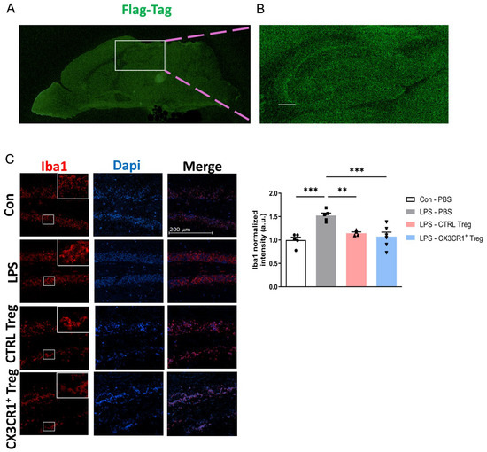 In mouse models induced by LPS, amyloid-beta (Aβ) primarily accumulates in the hippocampus, and microglia are activated around amyloid plaques [25,26]. Additionally, our previous research has shown that in Alzheimer’s disease models, adoptive Tregs migrate towards areas surrounding Aβ [21]. Based on this, we hypothesized that Tregs would be distributed around the hippocampus, and we confirmed this hypothesis. To visualize retrovirus-induced Tregs in specific areas of the mouse brain, we analyzed paramedian sagittal sections of CX3CR1+ Tregs that migrated to the brain using confocal laser scanning microscopy with antibodies against the DYKDDDDK tag (Flag tag) (Figure 3A,B). Subsequently, we performed an analysis of activated microglia using Iba1 antibodies. Iba-1 has been reported as a microglia-specific marker and is widely used for detecting microglia [27]. The immunofluorescence images showed increased reactivity of Iba1 in the LPS-treated mice compared to the control group. Interestingly, CX3CR1+ Treg treatment significantly decreased the immunofluorescence reactivity of Iba1 in the DG region of the hippocampus compared to the LPS-treated group (Figure 3C).