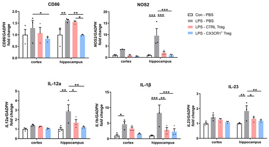 Treg downregulates proinflammatory mRNA expression. Quantitative RT-PCR analysis of genes encoding for proinflammatory markers, CD86, NOS2, IL12a, IL1b, and IL23, in cortex and hippocampus compared to control and LPS-treated group. Relative fold changes indicate mean ± SEM from three independent experiments (5 mice/group). * p < 0.05, ** p < 0.01, *** p < 0.001.