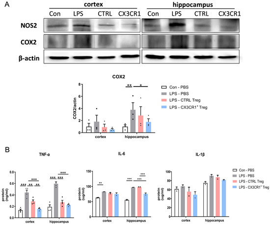 CX3CR1+ Tregs effectively halted the activation of inflammatory pathways and subdued the expression of proinflammatory cytokines in an LPS-induced mouse model. (A) Western blotting of NOS2 and COX2 proteins. The expression differences in the cortex and hippocampus of mouse brains are represented by a histogram. β-Actin was used as a loading control. (B) The expression of the proinflammatory cytokines TNF-α, IL-6, and IL-1β in brain homogenates. The data are described as the mean ± SEM (5 mice/group). * p < 0.05, ** p < 0.01, *** p < 0.001.