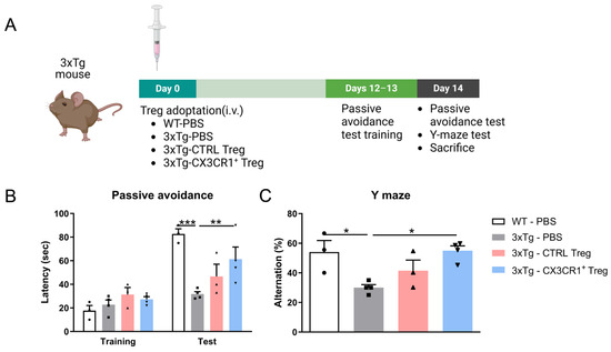To confirm the effects of CX3CR1-transduced Treg injection, Y-maze and passive avoidance tests (PATs) were performed. The PAT was performed to estimate learning and memory capacity. The apparatus consisted of a lit chamber and a dark chamber (20 cm × 20 cm × 30 cm) divided by a door. On the training day, mice were placed in a lit chamber facing away from the door. Upon the mice entering the dark chamber, the door was closed, and foot shock (0.35 mA, 2 s) was delivered. Thirty seconds after shock, the mouse was removed. The experimental animals underwent training for the passive avoidance test over two days. On the test day, the animals were placed in a lit chamber, and the latency to enter the dark chamber was recorded. No foot shocks were administered during this session; only the time taken to enter the dark compartment was measured. This approach was designed to minimize stress on the animals while accurately assessing their memory retention. Following the passive avoidance test, the Y-maze test was conducted to evaluate spatial working memory. The Y-maze consisted of three identical arms arranged at 120° angles. The animals were placed in one arm facing the wall to begin the test. They were allowed to freely explore all three arms for 5 min, and their behavior was recorded throughout the session. After completing the Y-maze test, the animals were sacrificed.
