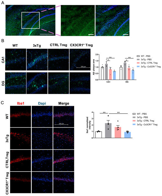 Moreover, we assessed the therapeutic effects of CTRL-Tregs and CX3CR1+ Tregs on AD pathology by staining the CA1 and DG of the hippocampus for Aβ. While CTRL-Tregs reduced Aβ accumulation, CX3CR1+ Tregs induced a more dramatic reduction, further corroborating their therapeutic potential (Figure 7B).