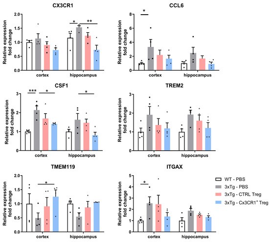 To evaluate activated microglia in 3xTg mice, we analyzed the mRNA expression levels of various DAM markers in the cortex and hippocampus (Figure 8). CX3CR1 is an important receptor that regulates neuron–microglia interactions during neuroinflammation [29], and CSF1 is a growth factor necessary for microglial proliferation and activation [30]. Both of these markers showed increased expression in 3xTg mice, indicating enhanced microglial activation. CX3CR1+ Treg treatment suppressed this increased expression in the cortex and hippocampus, demonstrating a reduction in microglial activation. CCL6 and TREM2, which are associated with immune cell recruitment and neuroprotection, respectively [31,32,33], as well as ITGAX, a marker involved in microglial activation, did not show significant results [34]. TMEM119, a microglial marker present in a normal brain, tends to decrease in expression in mouse models with brain injury. Microglia do not simply increase inflammation; they also play a dual role by regulating inflammation through phagocytic activity [35]. CX3CR1+ Tregs selectively increased TMEM119 expression in the cortex, which is associated with microglial phagocytic activity. This suggests that CX3CR1+ Tregs may play a significant role in promoting the phagocytic function of microglia, potentially aiding in the removal of neurotoxic substances from the brain [36].