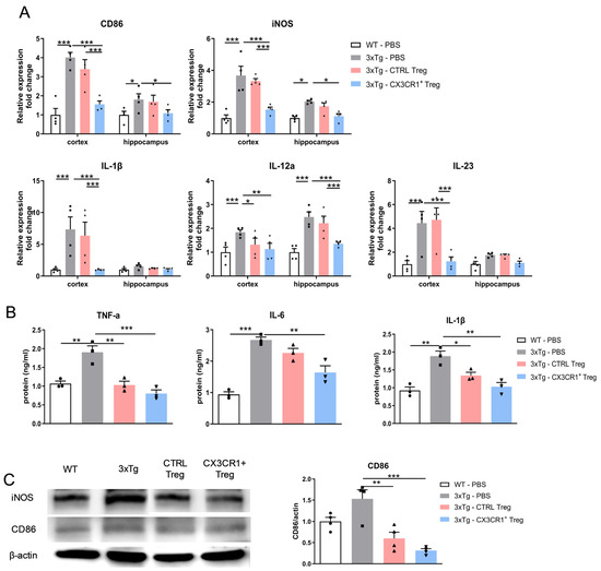 Although it has been reported that Treg attenuates proinflammatory microglial activity, it is unclear whether CX3CR1+ Tregs more effectively suppress the expression of activated microglia than CTRL-Tregs. To address this issue, the proinflammatory gene expressions CD86, iNOS, IL-1β, IL-12a, and IL-23 in the cortex and hippocampus were evaluated using RT-qPCR, with β-Actin used as an internal control to calculate fold changes in gene expression (Figure 9A). CTRL-Tregs did not induce the suppression of most proinflammatory gene expressions in the cortex and hippocampus, except for the expression of IL-12a in the cortex. However, CX3CR1+ Tregs had a significant effect on suppressing the proinflammatory mRNA expressions of the hippocampus compared to 3xTg or even to CTRL-Tregs.
