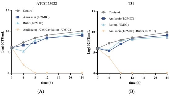 Time–kill curves of rutin and amikacin combined against Escherichia coli. (A): Escherichia coli ATCC 25922; (B): Escherichia coli T31.