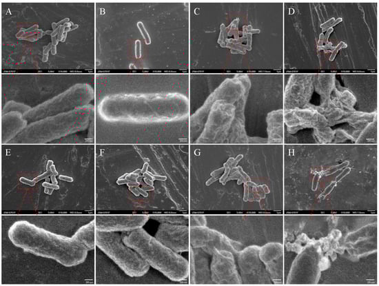 Scanning Electron Microscopy observation of Escherichia coli morphology (10,000×). (A): Escherichia coli ATCC 25922; (B): Amikacin-treated Escherichia coli ATCC 25922; (C): Rutin-treated Escherichia coli ATCC 25922; (D): Rutin and Amikacin-treated Escherichia coli ATCC 25922; (E): Escherichia coli T31; (F): Amikacin-treated Escherichia coli T31; (G): Rutin-treated Escherichia coli T31; (H): Rutin and Amikacin-treated Escherichia coli T31. The red parts are the representative change of the pictures.