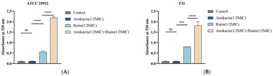 To investigate the bactericidal performance of rutin and amikacin both individually and in combination, a time–killing kinetics assay was performed against E. coli ATCC 25922 and T31. As displayed in Figure 1A, the combination of rutin and amikacin displayed a faster sterilization rate compared to rutin and amikacin used alone against E. coli ATCC 25922. Rutin combined with amikacin achieved a bacterial reduction of more than 5 log (killing 100% bacteria) within 8 h. Similarly, the combination of rutin and amikacin completely inhibited the growth of E. coli T31 within 8 h (Figure 1B). These results indicated that rutin combined with amikacin exhibited rapid bactericidal kinetics against E. coli ATCC 25922 and E. coli T31, which were beneficial in preventing the development of bacterial resistance.