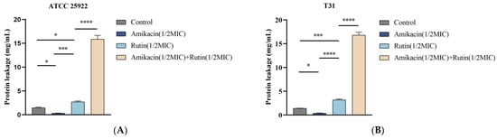Effect of rutin and amikacin alone or combined on Escherichia coli protein leakage. (A): Escherichia coli ATCC 25922; (B): Escherichia coli T31. Each value is presented as the mean ± SD (n = 3). * p-value < 0.05, *** p-value < 0.001, **** p-value < 0.0001.