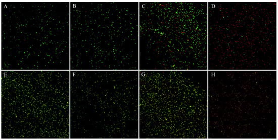 Confocal Laser Scanning Microscopy observes changes in Escherichia coli cell membrane integrity. (A): Escherichia coli ATCC 25922; (B): amikacin-treated Escherichia coli ATCC 25922; (C): rutin-treated Escherichia coli ATCC 25922; (D): rutin and amikacin-treated Escherichia coli ATCC 25922; (E): Escherichia coli T31; (F): amikacin-treated Escherichia coli T31; (G): rutin-treated Escherichia coli T31; and (H): rutin and amikacin-treated Escherichia coli T31. Scale Bar: 50 µm.