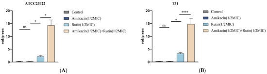 Analysis of the red–green ratio of bacteria in Confocal Laser Scanning Microscopy results. (A): Escherichia coli ATCC 25922; (B): Escherichia coli T31. Each value is presented as the mean ± SD (n = 3). ns p-value > 0.05, * p-value < 0.05, **** p-value < 0.0001.
