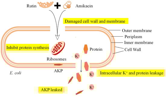 Disruption of cell membranes is usually the primary mode of action of antibacterial drugs. Many studies have confirmed that flavonoids can inhibit bacterial activity by acting on bacterial cell membranes and cell walls [19]. Quercetin has been demonstrated to inhibit the growth of different Gram-positive and Gram-negative bacteria, as well as fungi and viruses. The mechanism of its antimicrobial action includes cell membrane damage and changes in membrane permeability [20]. This study revealed that combining rutin and amikacin to treat E. coli resulted in an increased leakage of bacterial AKP, K+, and protein. AKP, an intracellular enzyme, is located between the cell wall and the membrane. It can only be detected in the external environment when the cell wall is damaged [21]. The leakage of K+ and protein, which are cellular contents, indicates damage to the cell membrane integrity [22,23]. SEM and CLSM analysis revealed that after combined treatment with rutin and amikacin, the surface of E. coli shrank and the contents leaked, with a significant amount of PI entering the bacteria to emit red fluorescence. The results indicated that the combined application of rutin and amikacin destroyed the cell wall and cell membrane of E. coli, ultimately leading to the death of the bacteria. The mechanism of action of rutin and amikacin combined to inhibit E. coli is shown in Figure 8.