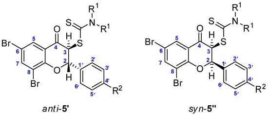 The structure of the newly synthesized 3-dithiocarbamic flavanones was proved by analytical and spectral data. The elemental analyses are presented in Supplementary Materials. The formation of the benzopyran ring was accompanied by important spectral changes. Thus, in addition to the NMR pattern of the para-substituted aromatic ring from aminal 4, we can see the loss of the phenolic proton signal, as well as of the methylene group signal from dithiocarbamate 3 (ca. 4.8 ppm) and the appearance of the distinct pattern of hydrogen atoms near the C-2 and C-3 positions of the benzopyran ring for both diastereoisomers between 5.7 and 6.4 ppm. Since these two protons can be situated either on the same side or on opposite sides of the molecule’s plane, two diastereoisomers, anti-5′ and syn-5″, can be formed (Figure 2). The relative orientation of the two hydrogen atoms would naturally be expected to affect the size of their coupling constants. The syn-isomers consistently showed a coupling constant between 3.4 and 4.1 Hz, while the anti-isomers showed values around 7.2 Hz or appeared as multiplets due to signals overlapping.