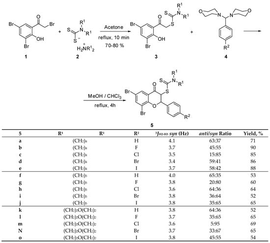 The synthetic strategy for the target 3-dithiocarbamic flavanones 5ao requires two major steps, as described in Scheme 1. The first one involves the synthesis of the corresponding phenacyl dithiocarbamates 3. This was accomplished by the reaction of 2-bromo-1-(3,5-dibromo-2-hydroxyphenyl)ethan-1-one 1 with various salts of N,N-dialkyldithiocarbamic acid 2 according to the reported procedures in good yields (70–80%) [37,38,39]. The synthesis of the latter compounds was performed by the reaction of a secondary amine (pyrrolidine, piperidine and morpholine) with carbon disulfide [40]. In the second step, the treatment of phenacyl carbodithioates 3ao with various para-substituted aminals 4ao was performed using an experimental procedure reported by us, providing the expected 3-dithiocarbamic flavanones 5ao in good yields (52–90%) (Scheme 1) [41]. Thus, after 4 h in a refluxing mixture of methanol/chloroform (1:1 v/v), the desired products were isolated as non-separable mixtures of anti- and syn-isomers, as presented in Figure 2. The synthesis of flavanones 5c, 5h and 5m was recently presented by us [33].