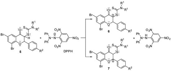 In our previous communication about antioxidant properties of 3-dithiocarbamic flavanones, we provided some insights regarding their mechanism of action [36]. We presented evidence regarding the existence of an enolate radical at the C-3 carbon atom of benzopyran ring (6, Scheme 2), but did not rule out the formation of a free radical at the C-2 position, which is a benzylic one (7, Scheme 2).