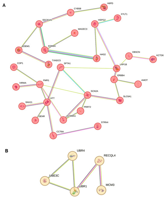 We performed protein–protein interaction enrichment analysis using STRING 3.0 (https://string-db.org/) (accessed on 1 September 2024) on our candidate genes (Supplementary Figure S1). Upon k-means clustering, this analysis revealed two predominant networks among the candidate genes identified (Figure 2A,B). The first network consisted of 28 nodes and 31 edges (average node degree: 2.21, average local clustering coefficient: 0.463, and PPI enrichment p value: 5.23 × 10−10) consisting of 28 proteins associated with components of the presynaptic and postsynaptic membranes. These genes include AMOT, CCT6A, COP1, CYB5B, DENR, EDEM1, ERBB4, FMR1, H6PD, HAS2, HSPG2, HTT, KCNMA1, KCTD6, KDM6A, LRP1B, MAGEC3, OBSCN, PRRT2, SCN2A, SEC61A1, SLC6A1, SNX21, SPTA1, STRN4, TXNDC5, VIRMA, and XYLT1 (Figure 2A). The presynaptic membrane is essential for neurotransmitter release and synaptic transmission, processes fundamental to brain function. In ASD, abnormalities in presynaptic mechanisms have been implicated as contributors to the neurobiological features [90,91,92]. The second network consisted of 5 nodes and 5 edges (average node degree: 2, average local clustering coefficient: 0.667, and PPI enrichment p value: 2.71 × 10−6) and was characterized by ubiquitin-conjugating enzyme activities involving genes such as UBR1, UBR4, UBE3C, RECQL4, and MCM3 (Figure 2B). Ubiquitin-conjugating enzymes play a vital role in the ubiquitin–proteasome system, which regulates protein degradation and turnover, thereby maintaining cellular homeostasis and various cellular functions. With respect to ASD, disruptions in ubiquitin-conjugating enzyme activity could affect protein homeostasis, synaptic function, inflammation, stress responses, as well as neuronal differentiation, migration, and synaptogenesis, which are all relevant to neurodevelopmental processes [93,94,95].