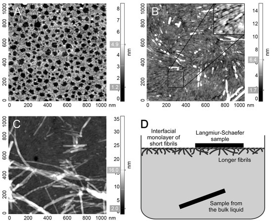 Representative AFM images of V187MANAFSYWQ196 peptide on Ultraflat polystyrene support. (A) Sample from the bulk liquid. (B,C) The sample was prepared by Langmuir–Schaefer and transferred from the liquid-air interface. Panel B illustrates the complete monolayer of short fibrils present on the liquid-air interface with rare fibrils on top (white). The inset contains 2× enlarged fragment of short fibrils monolayer for visual clarity. Panel C hows bundles of longer fibrils of various morphology on top of this monolayer. (D) The scheme of prepared samples revealed the localization of fibrils.