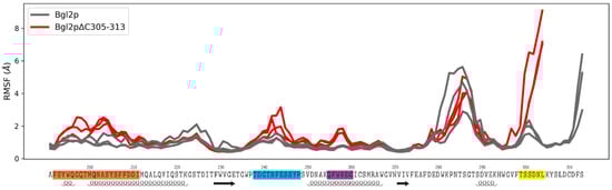 The impact of deletion of nine amino acid residues of Bgl2p from the C-terminus on the conformational stability of certain regions of the Bgl2p molecule. RMSF profiles in the C-terminal region along the sequence for Bgl2p and Bgl2pΔC305–313 are shown with designations of the secondary structure elements: α-helices underlined as helices, β-strands underlined as arrows. Three curves for each system correspond to three independent calculations. The protein sites with mobility changes reproducibly are highlighted in color: region 192–211—orange, region 238–248—blue, region 255–260—purple, region 299–304—yellow.