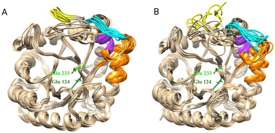 An illustration of the conformational mobility obtained during the MD calculations of (A) Bgl2p and (B) Bgl2pΔC305–313. The color scheme of the sites, the mobility of which changes with the deletion of the C-terminal region, corresponds to Figure 5; the amino acid residues of the active center are marked in green (Glu-233—light green, Glu-124—dark green). An overlay of several frames from the MD trajectory is presented to illustrate conformational mobility/variability.
