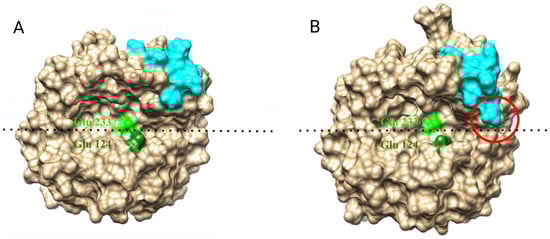 The conformations of the loop forming by aa 238–248 affect the geometry of the Bgl2p catalytic gap. (A) Bgl2p structure. (B) Bgl2pΔC305–313 structure. Loop 238–248 are depicted in cyan. Active site: Glu-233—light green, Glu-124—dark green. The dotted line indicates the catalytic gap. The red circle indicates the overlapping zone of the catalytic gap.