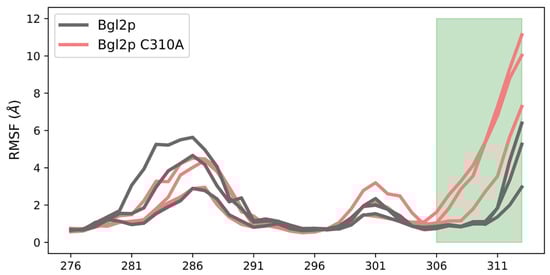 The conformational mobility of the C-terminus (marked in green) of Bgl2p structures, non-mutated (gray) and with C310A substitution (coral). RMSF profiles of three trajectories for both structures.