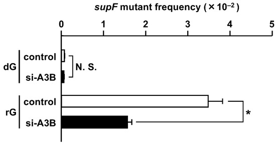 Effects of the APOBEC3B knockdown on the supF mutant frequency induced by rG. APOBEC3B was knocked down using si-APOBEC3B, and then the control plasmid or the rG-plasmid was introduced into the knockdown cells. The supF mutant frequency was calculated as described in Figure 1. Transfection experiments were performed three times. Data are expressed as the means + standard errors; control, control RNA; si-A3B, si-APOBEC3B; N. S., not significant. * p < 0.05.