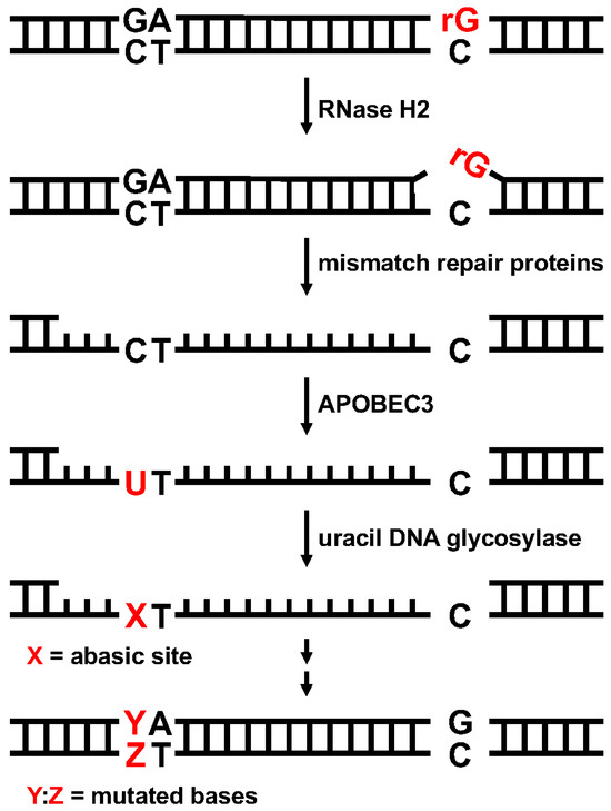 The nick formation and subsequent strand degradation could result in the exposure of the ss region in the strand complementary to the rG strand in the transfected DNA, based on the report by Chen et al. [26]. Mismatch repair proteins are hypothesized to be involved in this strand degradation (Figure 6). The APOBEC3 enzymes deaminate C bases on ss DNA more efficiently than those on ds DNA [33]. The involvement of APOBEC3 in action-at-a-distance mutations was indicated by our previous and present studies (dGO and rG, respectively) [25]. The formed U bases would be removed by uracil DNA glycosylase to produce abasic (apyrimidinic) sites, and this non-instructive lesion would cause various substitution mutations [34,35]. Specialized translesion synthesis DNA pol(s) are expected to bypass the abasic sites during DNA synthesis where the exposed ss DNA acts as the template.