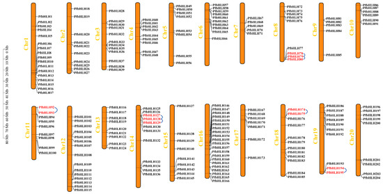 Schematic representation of the chromosomal localization of PfbHLH genes, with chromosome numbers indicated in yellow and tandem duplications highlighted in red.
