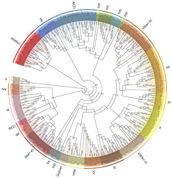 Phylogenetic analysis is crucial for understanding the evolutionary relationships of a system, revealing sequence similarities, and identifying potential functional homology. A neighbor-joining phylogenetic tree was constructed using 205 PfbHLHs, 162 Arabidopsis bHLHs, and eight bHLHs with known functions from (S. miltiorrhiza; Vitis amurensis; Populus euphratica; Zea mays; Cucumis sativus; Glycine max) (SmbHLH37, SmbHLH92, SmbHLH51, VaICE1, PebHLH35, ZmbHLH55, CsbHLH041, and GmbHLH300) [25,26,27,28,29,30,31] (Figure 3). All bHLH proteins were classified into 23 subfamilies based on the Arabidopsis bHLH protein family classification [2]. The PfbHLH proteins were distributed across 21 subfamilies, with no members present in the orphan and XIII subfamilies. The XII subfamily contained the maximum number of members, totaling 38, while the XIII subfamily had the fewest, with only three members, none of which belonged to the PfbHLH family.